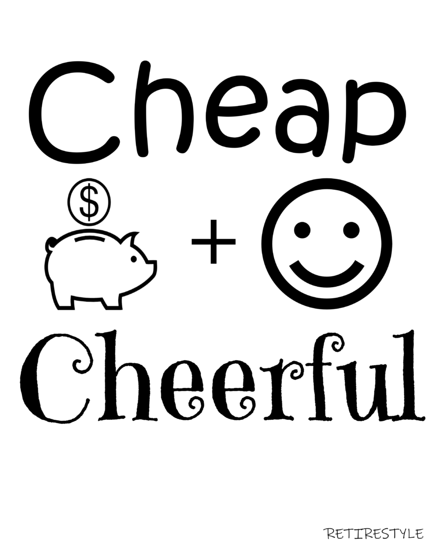 Great graphic design with a funny mantra (“Cheap and Cheerful”) for thrifty money-savers and frugal cheapskates to display proudly.